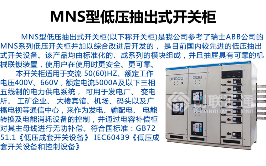 MNS型低壓抽出式開關柜適用于發電廠、變電站、石油化工、冶金軋鋼、輕工紡織等廠礦企業和住宅小區、高層建筑等場所,作為交流50~60Hz,額定工作電壓交流660V及以下的電力系統的配電設備的電能轉換、分配及控制之用。
