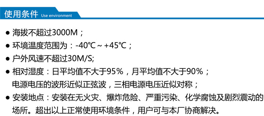 適用于自然條件比較惡劣的海灘、草原、荒漠等無火災(zāi)、無嚴(yán)重污染、無化學(xué)腐蝕介質(zhì)和粉塵、無爆炸性危險(xiǎn)運(yùn)行環(huán)境,可用于戶外、又可用于戶內(nèi)。