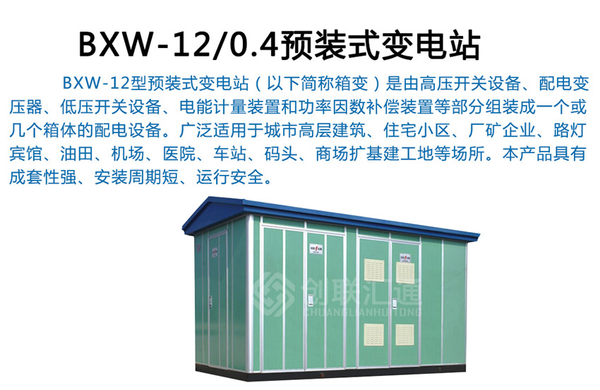 BXW-12型預裝式變電站(以下簡稱箱變)是由高壓開關設備、配電變壓器、低壓開關設備、電能計量裝置和功率因數補償裝置等部分組裝成一個或幾個箱體的配電設備。廣泛適用于城市高層建筑、住宅小區、廠礦企業、路燈、賓館、油田、機場、醫院、車站、碼頭、商場擴基建工地等場所。本產品具有成套性強、安裝周期短、運行安全