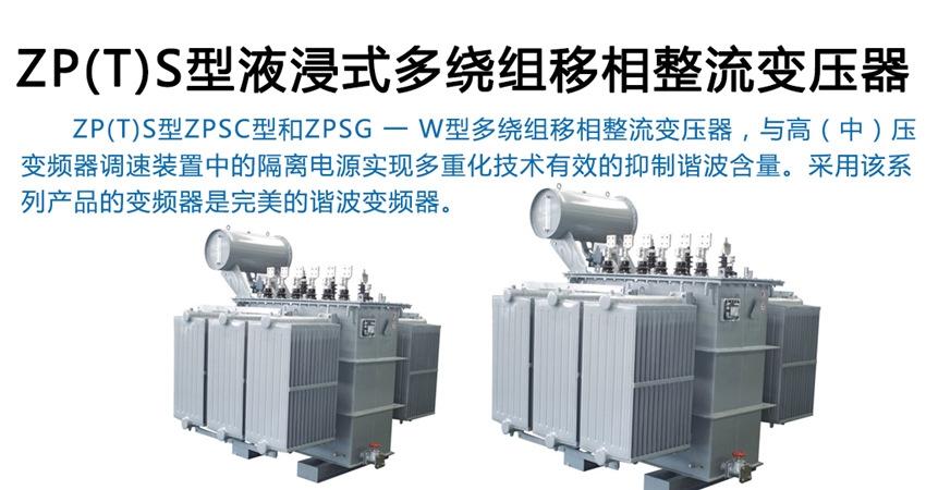 ZP(T)S型ZPSC型和ZPSG—W型多繞組移相整流變壓器,與高(中)變頻器調(diào)速裝置中的隔離電源實(shí)現(xiàn)多重化技術(shù)有效的抑制諧波含量。